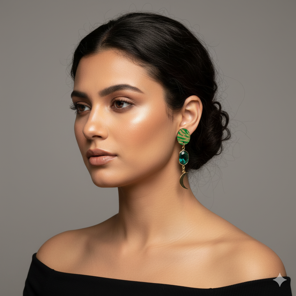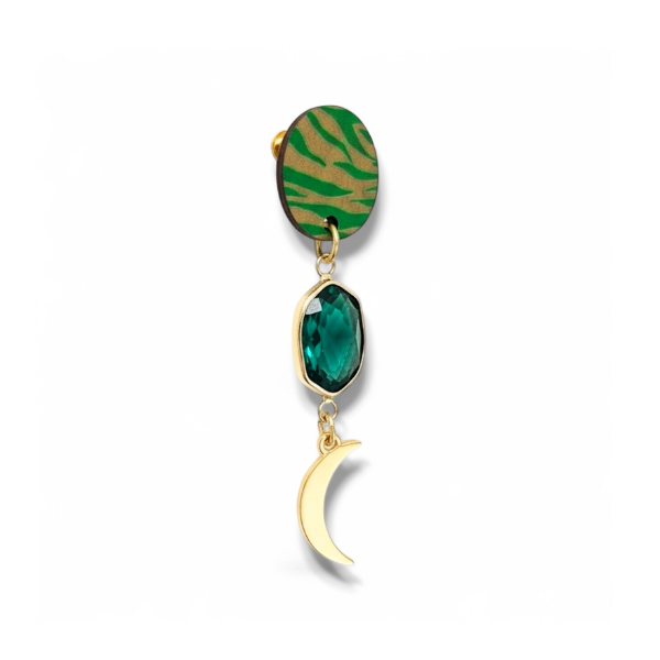 O Brinco Almost Full traduz a magia da lua em acessórios que combinam artesanato, cor e simbolismo. Na parte superior, a peça apresenta madeira com o animal print da marca Susana Farinha, detalhe que confere uma identidade única a cada brinco.