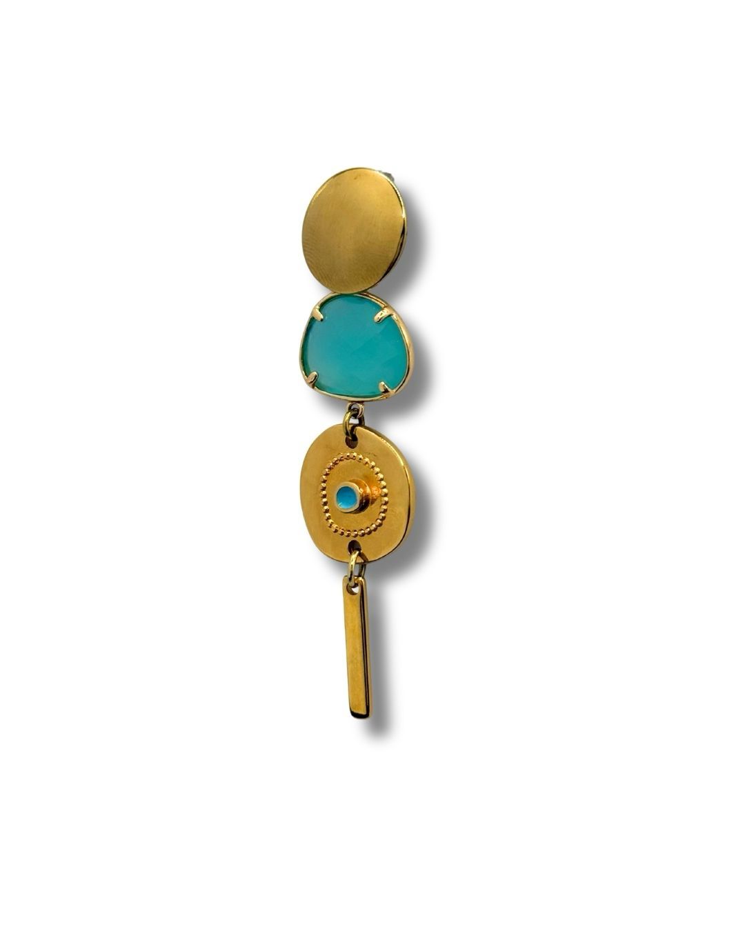 Brinco dourado com base redonda em aço, vidro azul turquesa em destaque e elemento circular com apontamento azul turquesa ao centro. O contraste entre o dourado e o azul cria um efeito luminoso e sofisticado, perfeito para dar cor ao rosto de forma equilibrada. Um modelo marcante, com linhas mais estruturadas e contemporâneas.