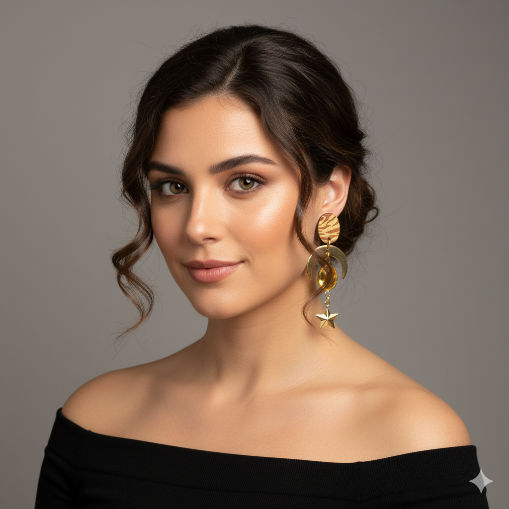 O Brinco Lunar Eclipse é uma peça artesanal que combina design exclusivo, brilho e simbolismo. A parte superior é feita em madeira com o animal print característico da marca Susana Farinha, conferindo autenticidade e irreverência a cada criação.