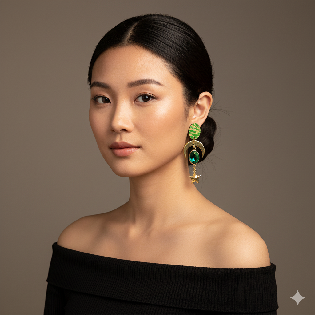 Disponível em três cores – verde esmeralda, amarelo dourado e vermelho rubi – o Brinco Lunar Eclipse é perfeito para quem procura brincos statement artesanais, leves, vibrantes e cheios de personalidade.