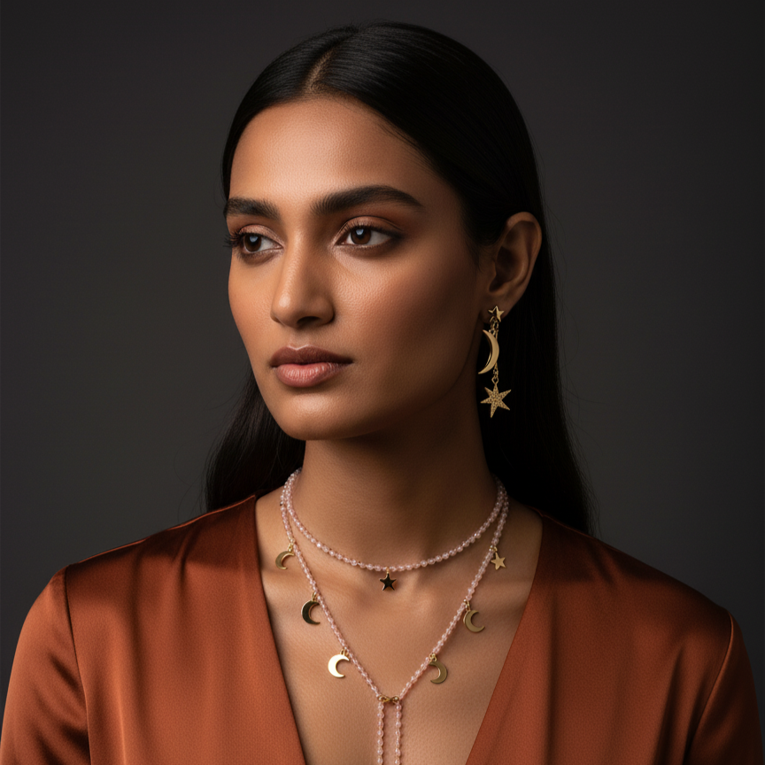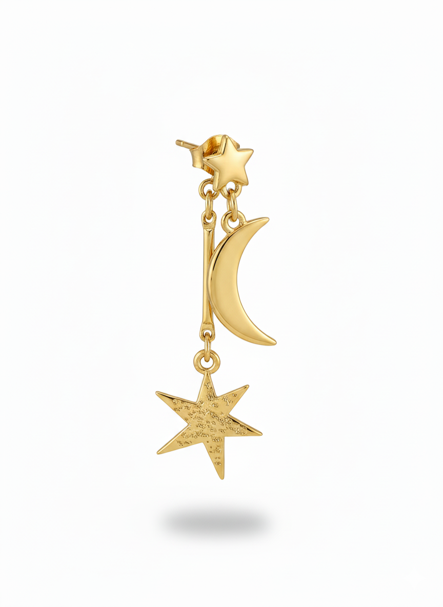 Uma peça que combina elementos celestiais com um design contemporâneo, ideal para adicionar um toque distinto ao visual. Pode ser usado sozinho ou combinado com outros brincos para um look mais arrojado.