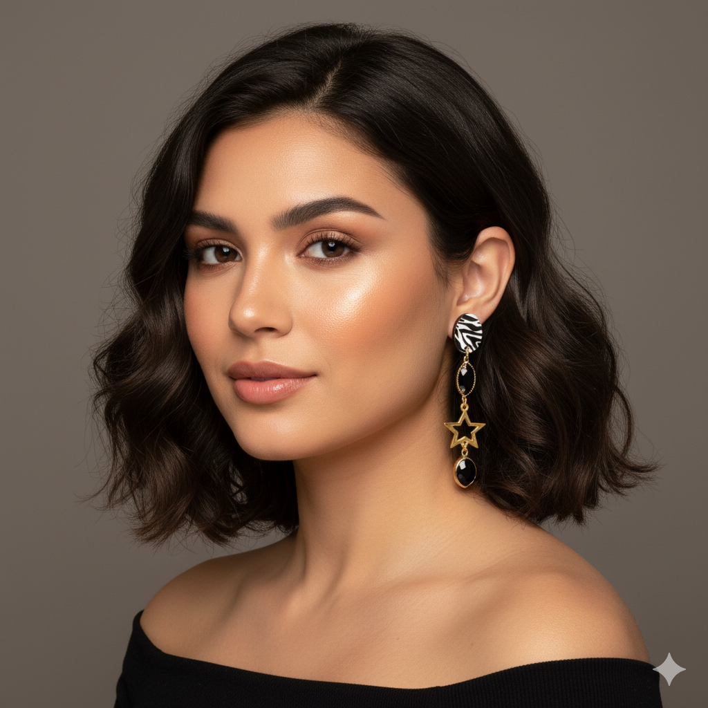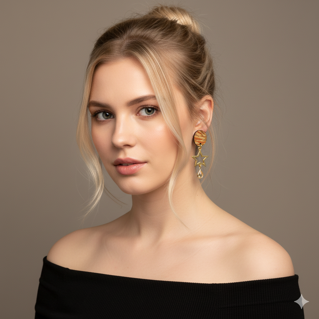 O Brinco Sirius é uma peça artesanal inspirada na estrela mais brilhante do céu. A parte superior é feita em madeira com o animal print exclusivo da marca Susana Farinha, um detalhe icónico que torna cada brinco único.