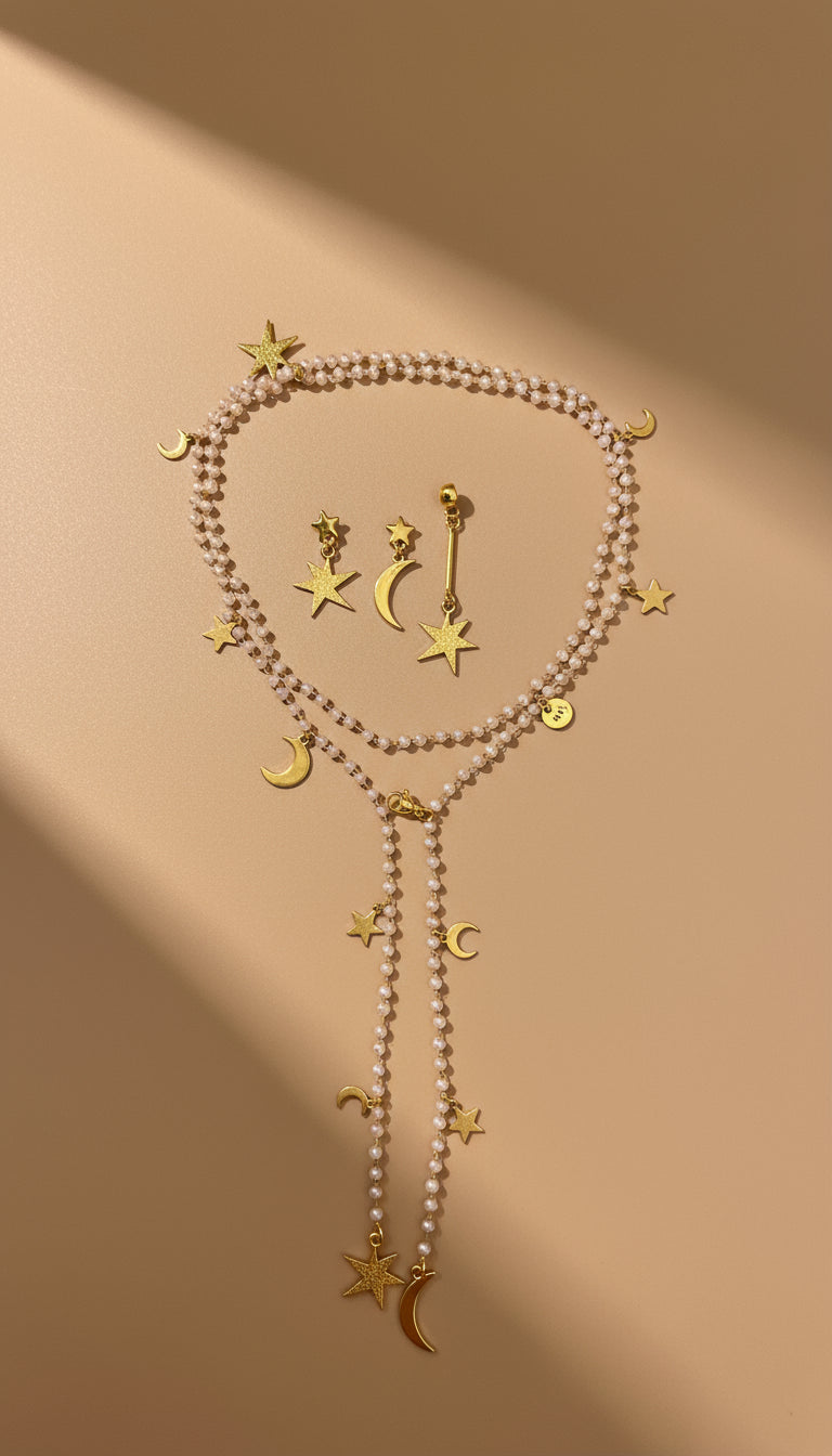 A corrente é feita de vidrinhos facetados perolados, que refletem subtilmente a luz, e é decorado com pendentes dourados de luas e estrelas, distribuídos ao longo de toda a peça.