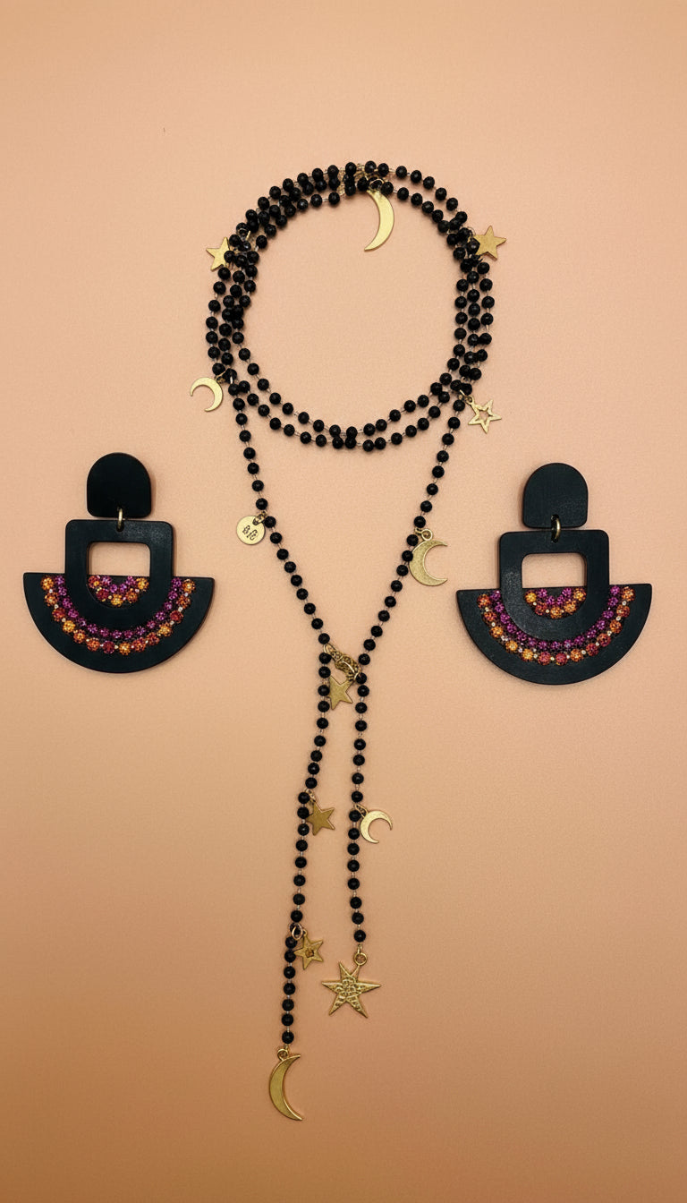 A corrente é feita de vidrinhos facetados pretos, que refletem subtilmente a luz, criando um brilho elegante e discreto. Ao longo de toda a extensão, encontras pendentes dourados em forma de luas crescentes e estrelas, que trazem um toque celestial e poético à peça.