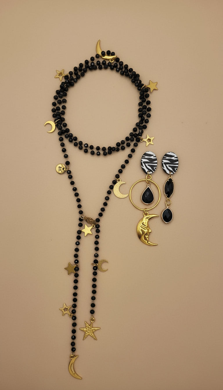 Composto por uma corrente de vidrinhos facetados pretos que refletem suavemente a luz, este colar é um verdadeiro camaleão do teu guarda-roupa. Pode ser usado: